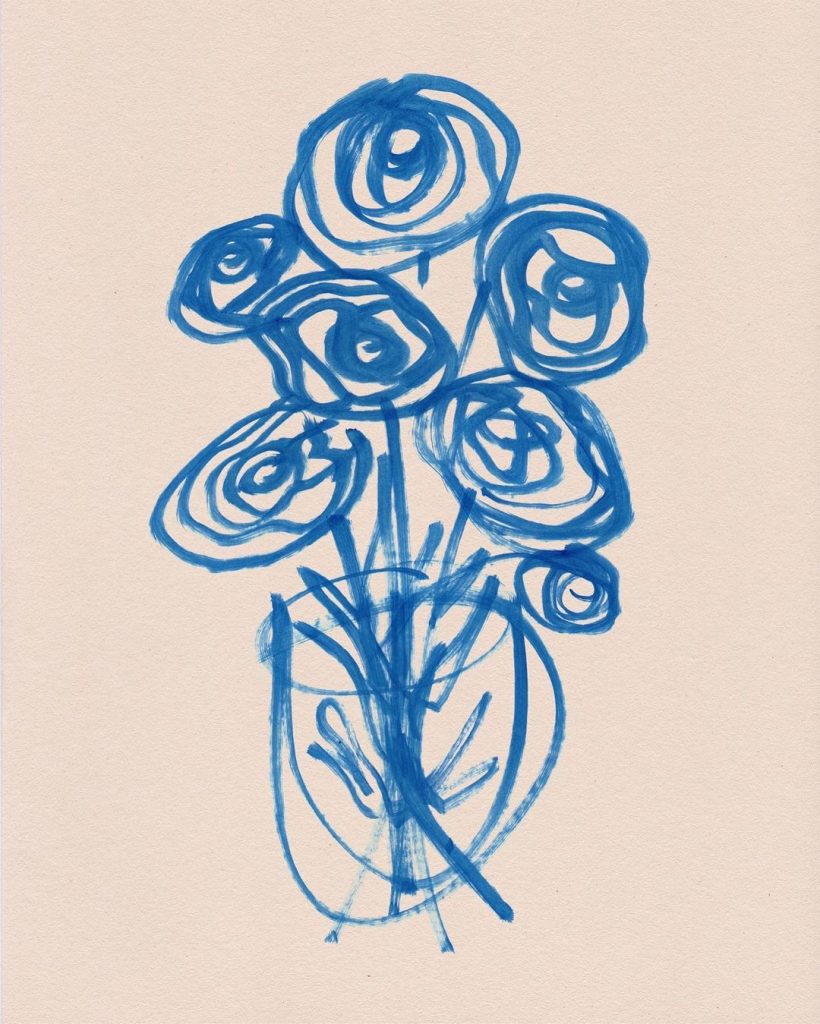 Brian de Graft says his artworks are “celebrations of life.” Think colourful, spontaneous scribbles of flowers, fruits, dogs and bumble bees. Helen Frankenthaler, Cy Twombly and Henri Matisse are all influences on this young German artist’s work. I’m a sucker for blue and white, but this vibrant bunch of blooms in a vase is pretty darn perfect.