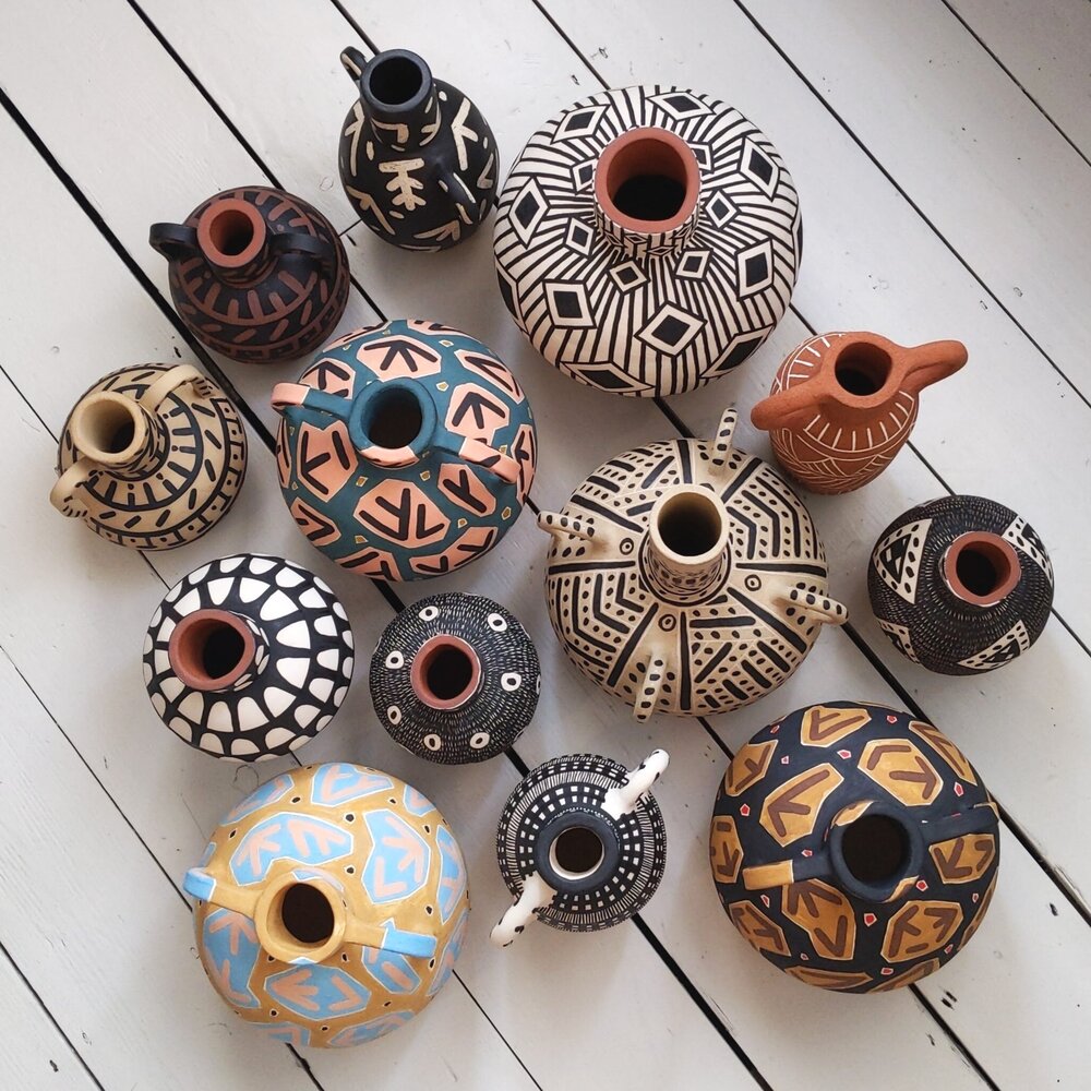 It’s Lydia Hardwick‘s bold and graphic patterns that pulled me in. Her designs remind me of ones we might see on African mud cloth. Hardwick works with stoneware and terracotta and uses stained slips and stained clay to create her surface decoration. Her pieces pay homage to traditional ceramics, while feeling utterly contemporary. This “grogged pot” is my favourite –– the ultimate vessel for flaming orange tulips.
