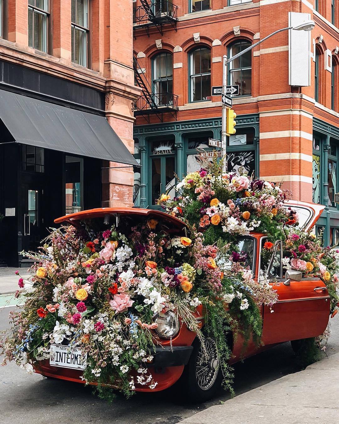 There’s a flower shop in London, Rebel Rebel, that designs arrangements that are a big, bold and wild expression of love. The style is mad cap and exuberant. And no bouquet is ever the same. I came across this image today, and it reminded of Rebel Rebel’s approach to blooms. It’s a wild English garden smooshed into a vintage Porche.