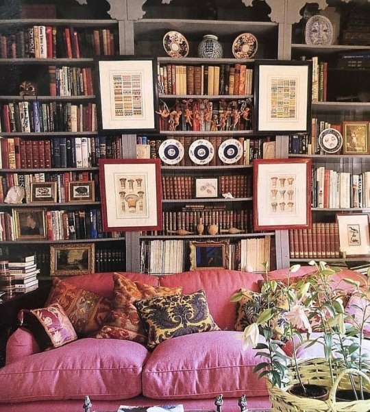 My brain is blancmange today, but I dd want to share this image, only because bookshelves like these are a bit of a fantasy, (Tom Wolfe is the only author I can make out) as is a sofa pink like the pinkest June peony.