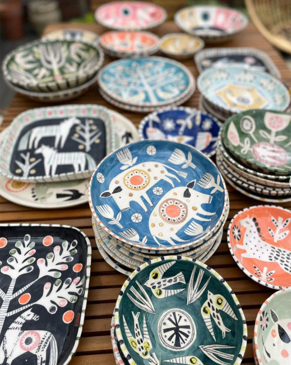 I really like Jane Ormes‘ use of pattern and colour. Her folk art inspired bowls could have belonged to your Great Aunt Astrilde, if Great Aunt Astrilde had superb taste. Her drawings are equally whimsical. I’m no fan of pigeons, but I do love this one. Have a scroll through her work. It’ll amuse and delight you.