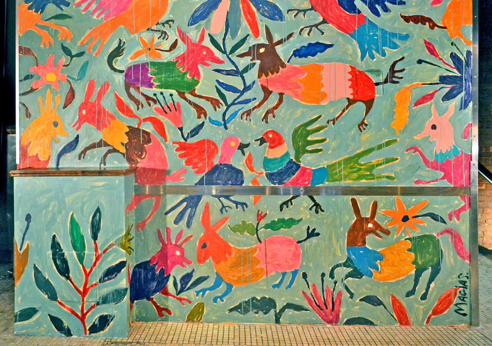 There’s a joie de vivre to Abel Macias’ work that I’m instantly drawn to. Macias’ Mexican heritage shines through every brushstroke. His murals are exuberant; think swirly trees, Otomi birds and multi-coloured cacti. His paintings of rocks, rainbows and desert scenes have a childlike simplicity that’s hard not to love. There’s an inherently positive vibe that runs through his work. Just what the world needs right now.